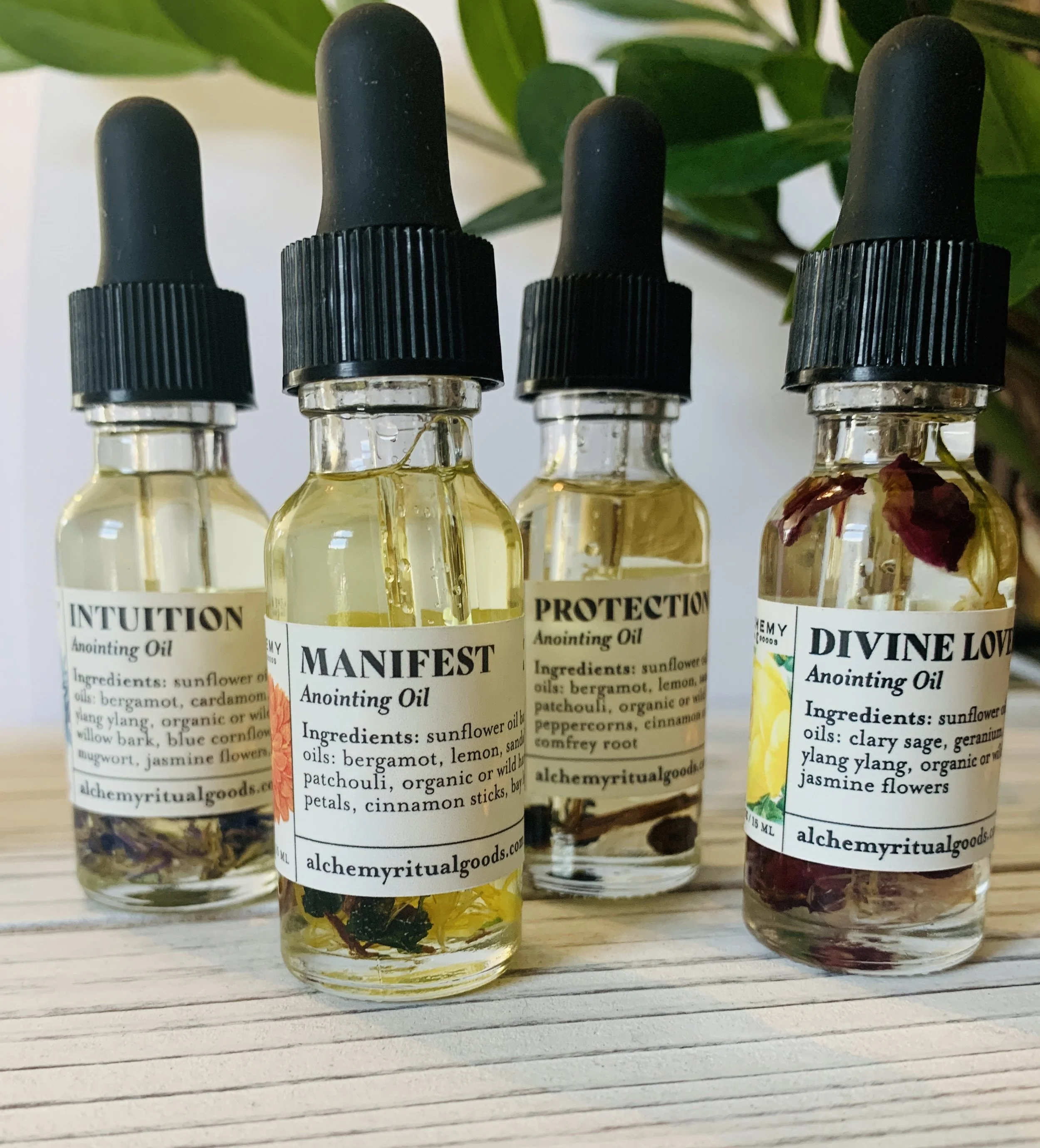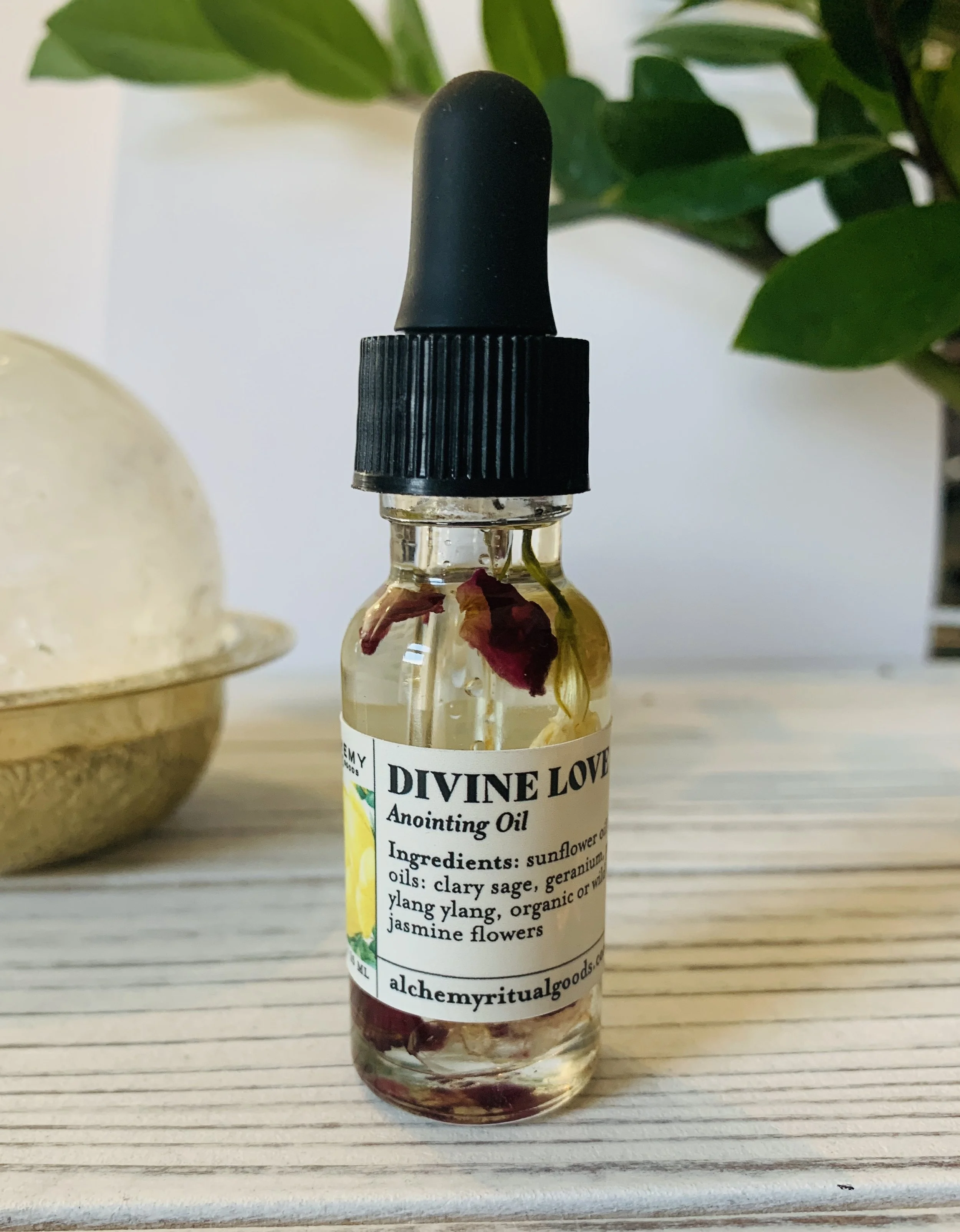 Anointing oils are as ancient as hu-mans relationship with the Divine and are used to connect your self, objects and ritual practices to higher realms and energies. Our Divine Love Anointing Oil is made in-house with love and prayer. It connects you to the heart of the universe, encouraging self-love and activating love in your life. Use to anoint your body, candles and tools.