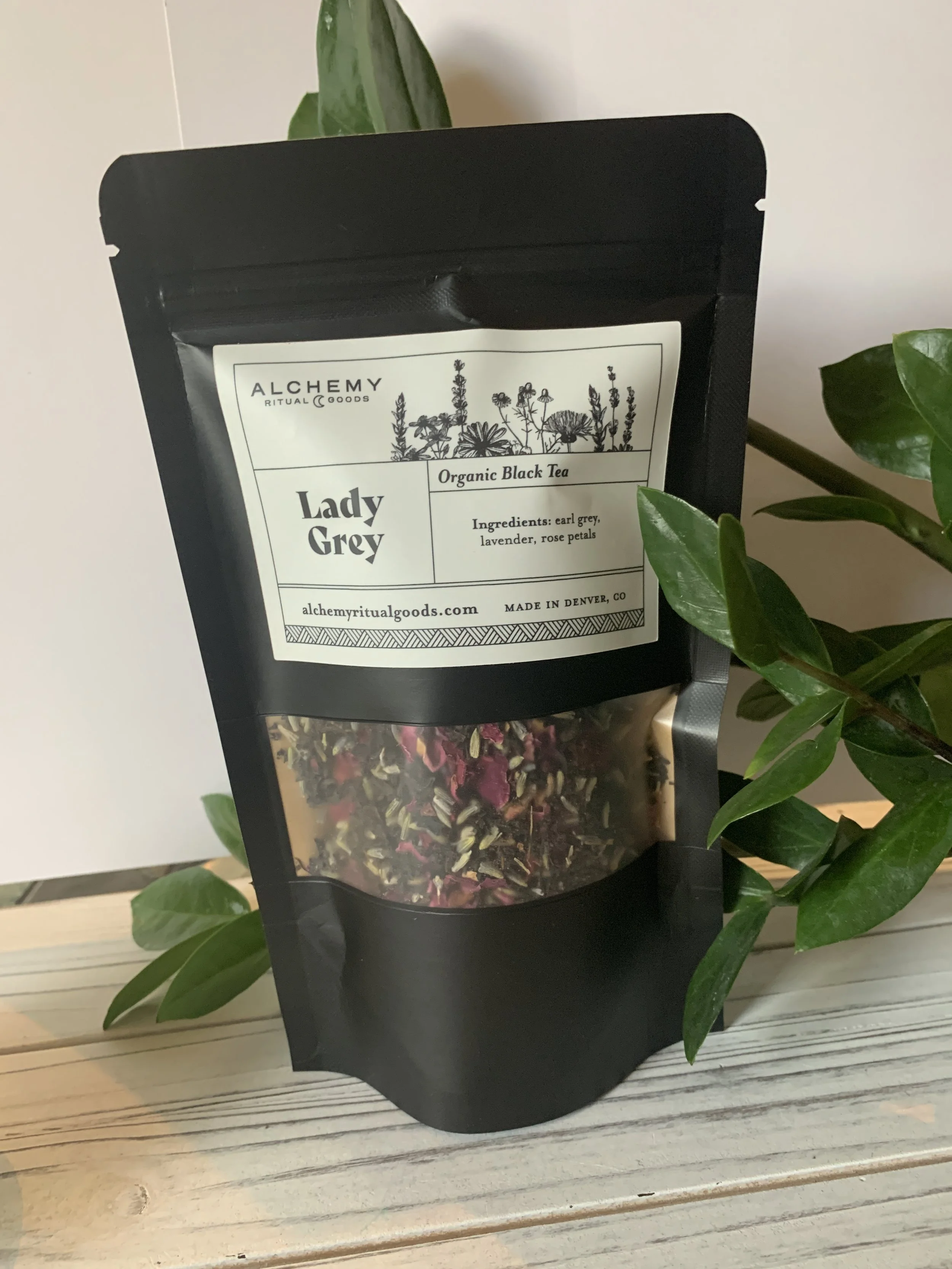 A delicate floral black tea, blended in house with organic and wild-crafted herbs. Comes in a black tea pouch with a see-through window. The pouch is 7" x 4" X 1.5" and contains 2 dry ounces.