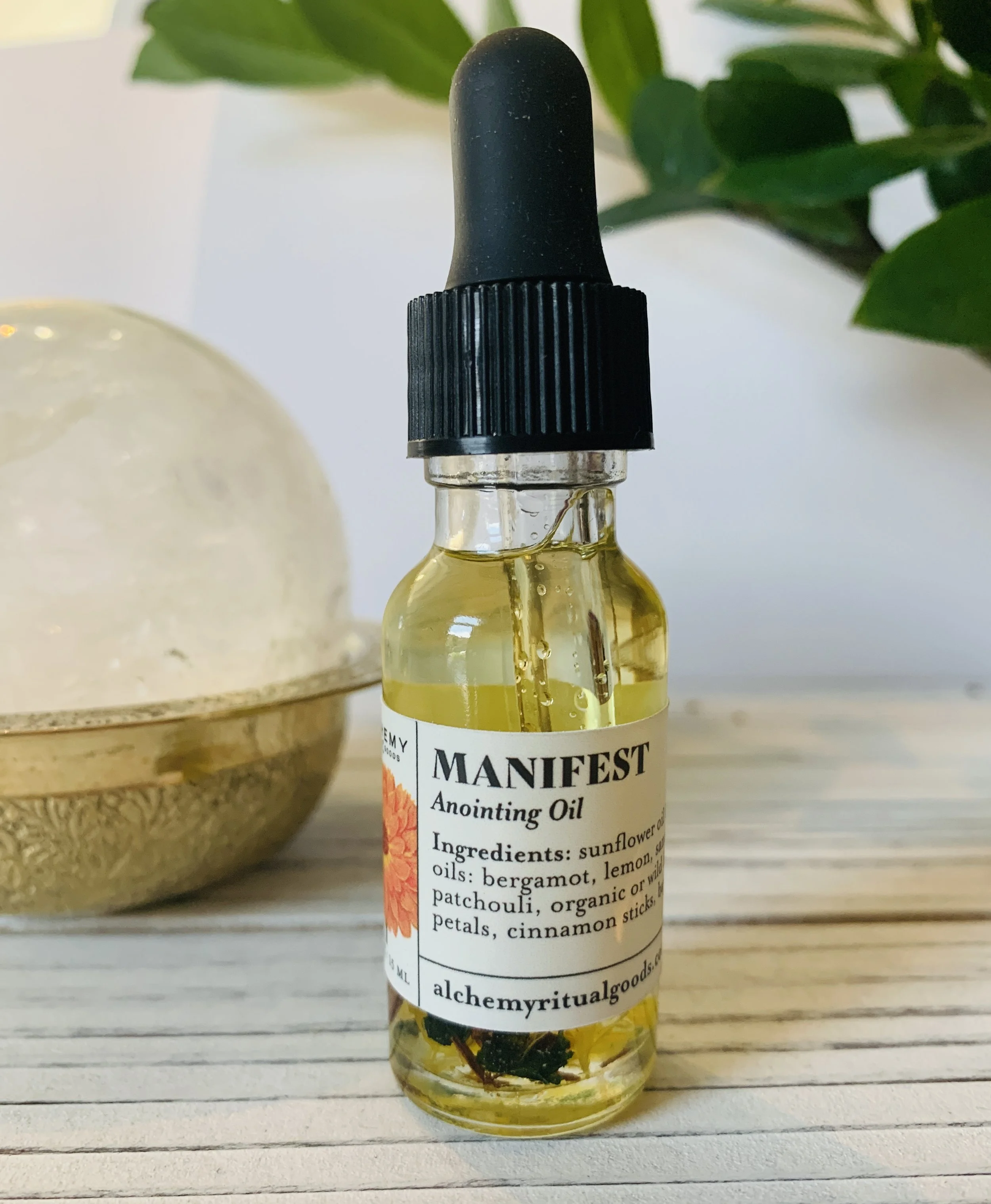 Anointing oils are as ancient as hu-mans relationship with the Divine and are used to connect your self, objects and ritual practices to higher realms and energies. Our Manifest Anointing Oil is made in-house with love and prayer. It will help you activate your intentions by magnetizing the energies of abundance, prosperity and opportunity to your ritual work. Use to anoint your body, candles and tools.